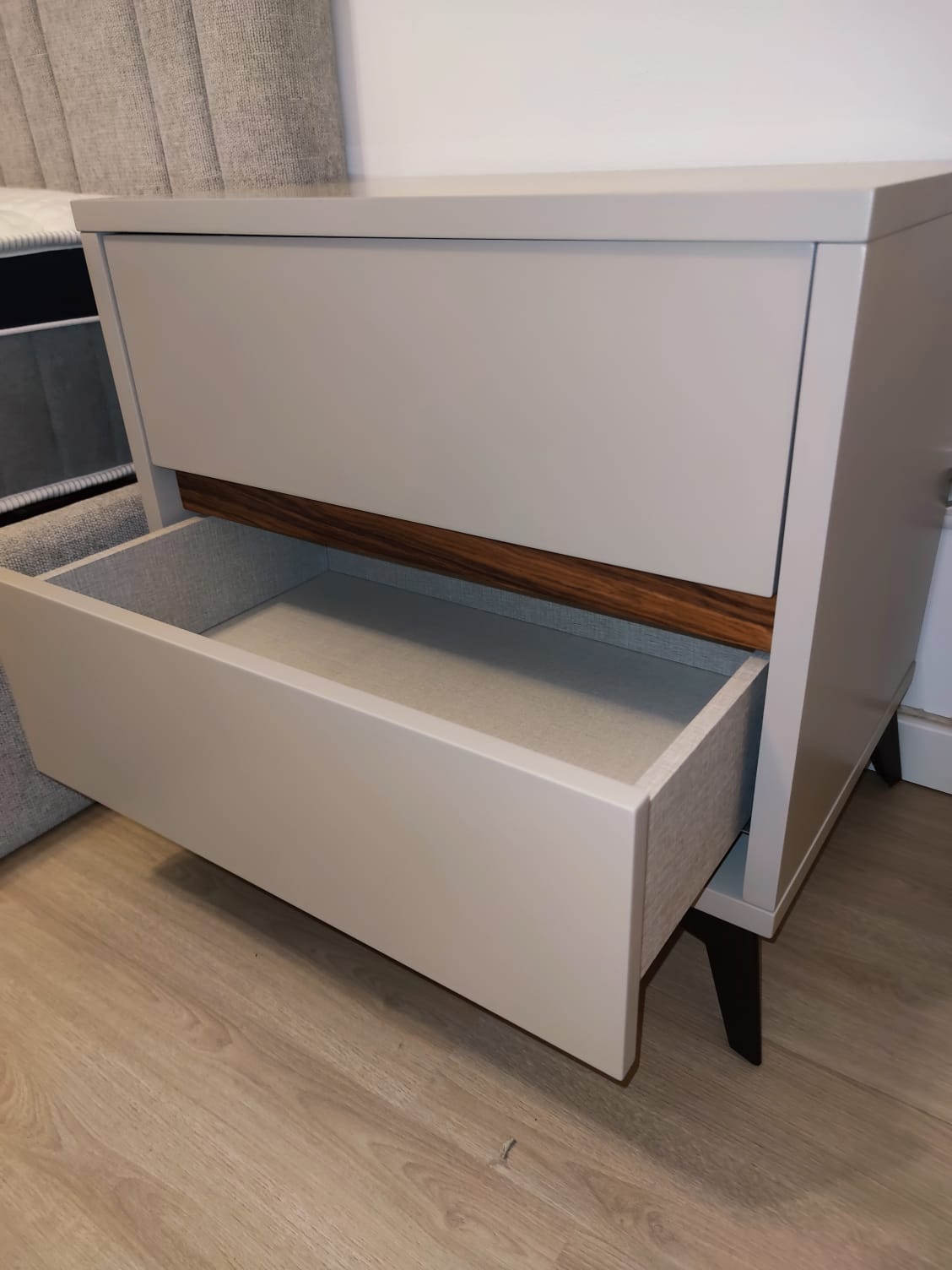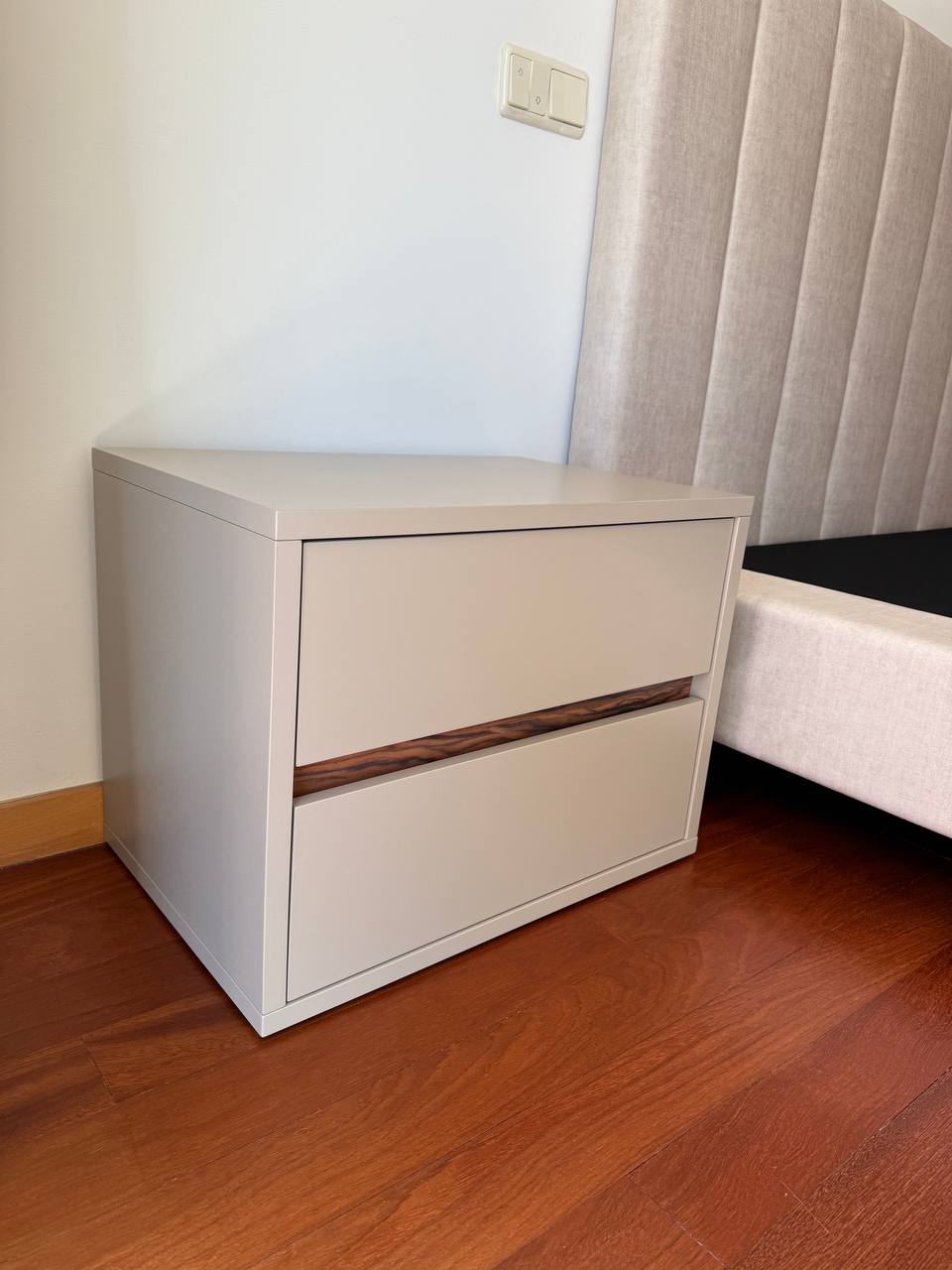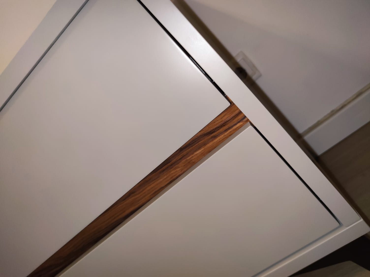 | Detalhe decorativo | Faixa em madeira entre gavetas |